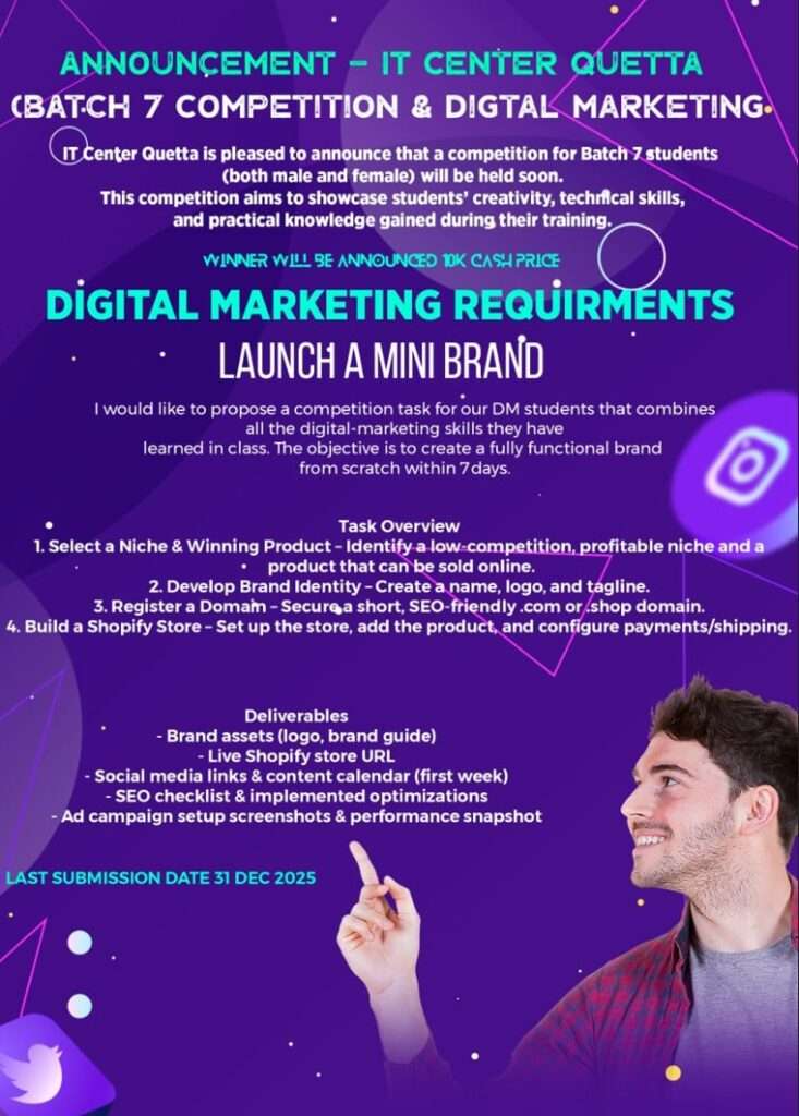 IT Center Quetta proudly announces a Digital Marketing Competition for Batch 7 students.